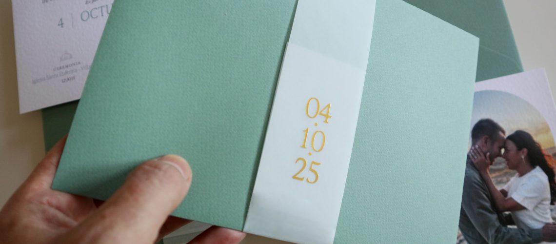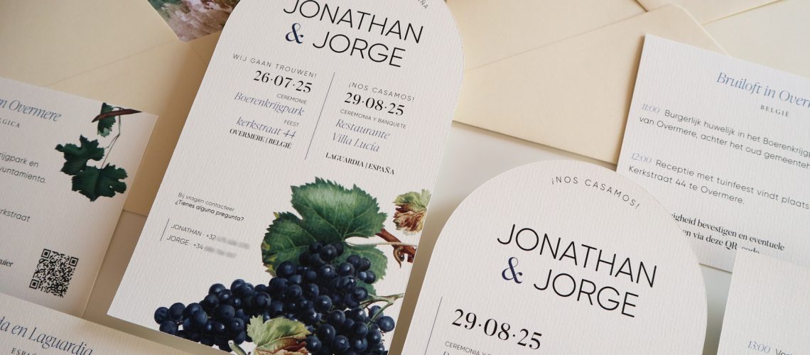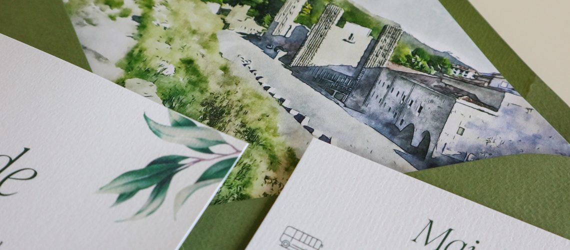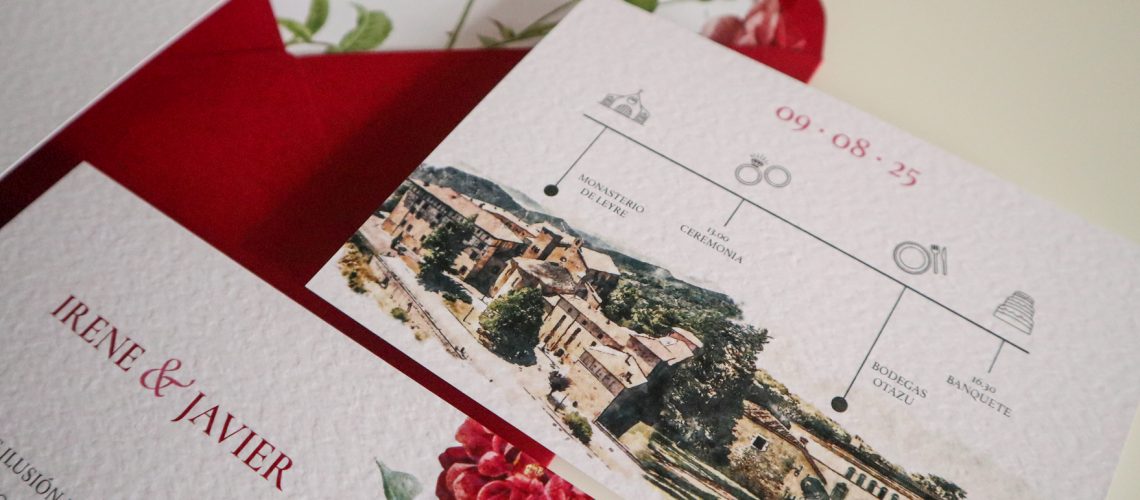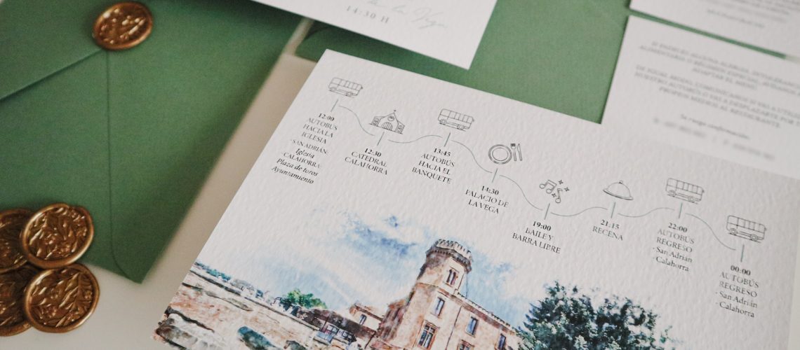 Ruth y Fernando quisieron que su invitación reflejara esa conexión con la tierra y sus raíces.Diseñamos una papelería inspirada en el paisaje riojano, con ilustraciones en acuarela, tonos verdes naturales y un sobre que guarda, en su interior, la vista del viñedo donde todo florece.Cada pieza fue pensada para transmitir la ...